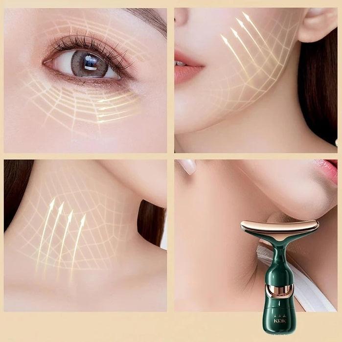 Das 3-in-1-Massagegerät ist eine echte Revolution in der Welt der Schönheitspflege für zu Hause. Es wurde für Frauen und Männer entwickelt, die Wert auf ihr Aussehen legen, und vereint Technologie und Komfort, um die Haut im Gesicht, am Hals und um die Augen zu pflegen. Kompakt, elegant und einfach zu bedienen, bietet es Ihnen die Wirksamkeit einer professionellen Pflege, ohne dass Sie dafür in ein Kosmetikstudio gehen müssen.